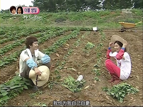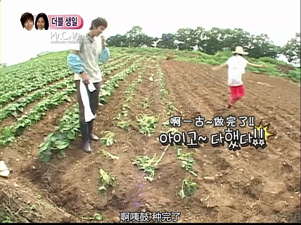 在山裡下車,EVENT新手容丈夫結巴地要徐玄等她兩分鐘好讓他去跟計程車問蔣串通好,徐玄看到周遭的景色都是山一點都不相信是要去釣魚,丈夫無條件地說「等下就會看到了」這位新手自己緊張起來,摀著夫人的眼睛走到田邊「這是我的禮物,紅薯田」太驚訝了,鄭容和今年撈很多讓他成為地主了!夫人驚訝又感動看著這一大片田地「這些紅薯都可以吃」鄭隊長只好吞吞吐吐地說出真相「只有兩行,而且現在是要種」夫人調侃說「原來生日禮物是要幹活」艷陽下,辛苦種著地瓜的夫婦,突然非常感謝丈夫只有租兩行地!這對音樂夫婦還給地瓜苗聽CNBLUE的歌,是說胎教的音樂還是要選古典音樂比較好!