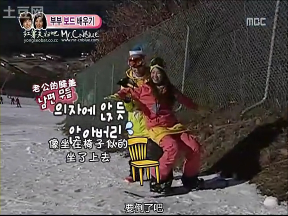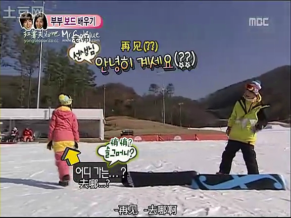 不過,現實好像跟八位姐姐說的不一樣,她們說:「去滑雪就要有像鄭女婿這樣的暖男!」大家幻想的浪漫情節只出現容大頭替夫人準備護具那部分,走到滑雪場馬上把滑雪板丟在地上!看來是來真的不是在玩的阿!做暖身運動,容大頭的小劇場他變身成滑雪場教練,玄夫人好像有點知道接下來不是開玩笑就可以混過去的,假裝自己有事轉身走的那招,好可愛!看到夫人轉身走掉的容大頭那茫掉的表情也是讓我不斷replay!