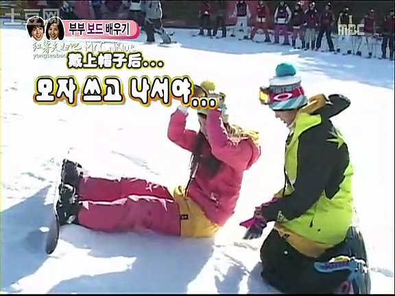先在初級場學完前滑馬上就到中級挑戰,幸好徐小玄就是學甚麼都很快,在中級場滑幾次馬上就抓到感覺,開心地大喊:「真得很有意思!」容大頭覺得可以再提高難度,為了可以完美體驗滑雪板所以要學背滑這樣才可以轉彎。看到鄭隊長示範的玄妹妹驚訝到嘴巴張大,我也覺得鄭隊長是不是在手中有偷偷牽線阿,怎麼他指向左邊就去左邊啊?!結果玄妹妹初次挑戰摔得很慘,應該飛掉地的帽子因為髮夾的關係掛在散亂的長髮邊,玄妹妹覺得太丟臉不希望站在遠處的丈夫過來,但是鄭丈夫不從她願,從下坡處爬上來(好像在演戰地戀人喔!)不知道是不是因為覺得有點對不起徐玄,徐玄問他「真的可以背滑?」他結結巴巴回答不太出來。